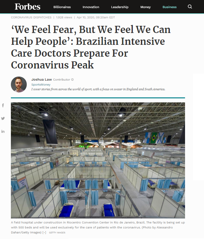 A reportagem, publicada no site da revista no dia 10 de abril, tem como título "We Feel Fear, But We Feel We Can Help People": Brazilian Intensive Care Doctors Prepare For Coronavirus Peak ("Sentimos medo, mas sentimos que podemos ajudar as pessoas": médicos brasileiros em terapia intensiva se preparam para o pico do coronavírus), mostra o trabalho desenvolvido por médicos na assistência aos pacientes acometidos pela Covid-19 no Brasil que, apesar do medo, mantêm-se firmes no propósito de ajudá-los na cura.