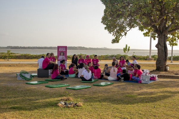 Sob a sombra de uma árvore, as mulheres contaram, cada uma, suas histórias após receberem o diagnóstico do câncer de mama. Elas também participaram de sessões de relaxamento e alongamento com o terapeuta ocupacional Ximenes Junior.